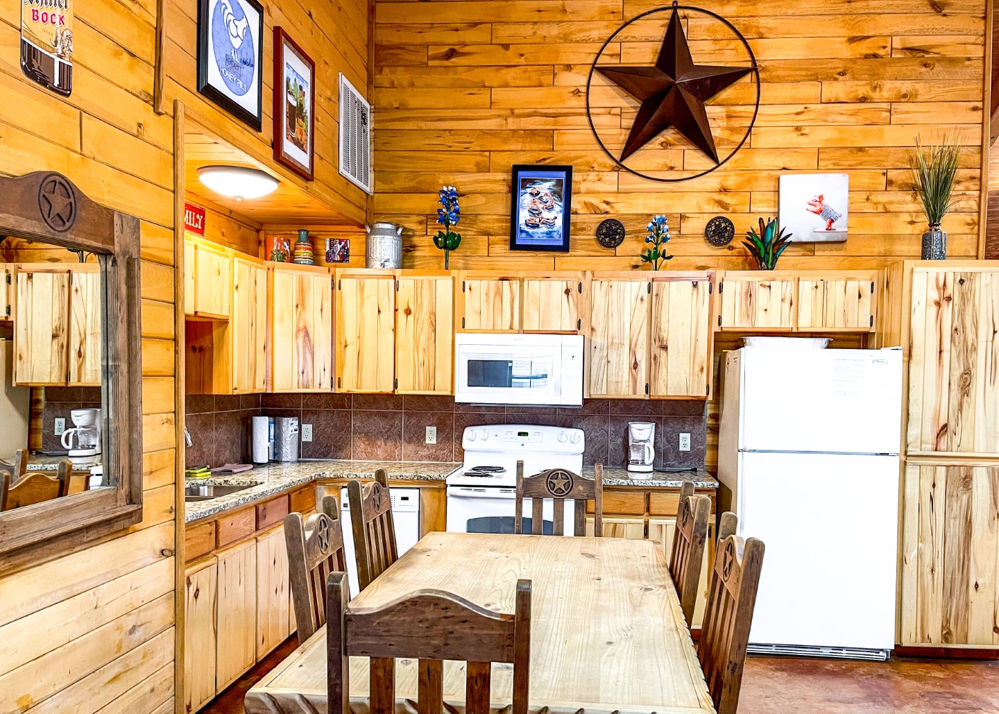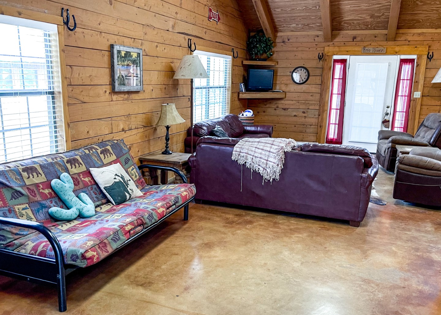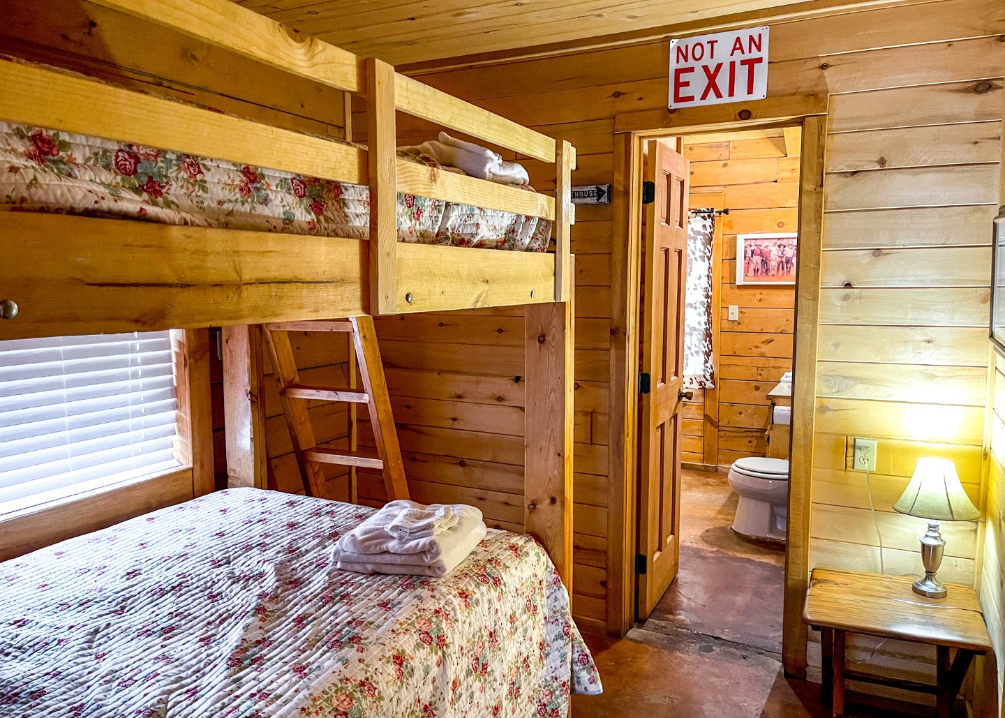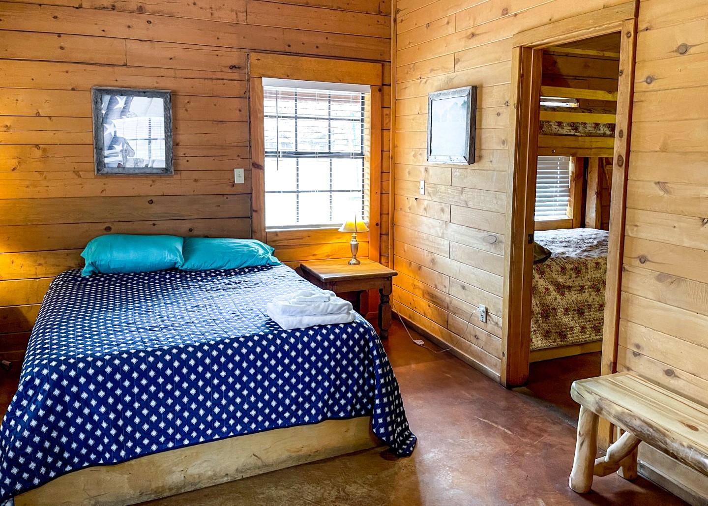 House #18 is fully furnished, color TV with DirecTV Satellite and DVD, front and back porches. Two bedrooms have queen size beds and a-single. The third bedroom has a queen bunk and attached bath. This house used to be our game room. It is located directly across from the office and next to a fire ring. Only three vehicles may be parked at this house ($5.00 per day charge for each additional vehicle).